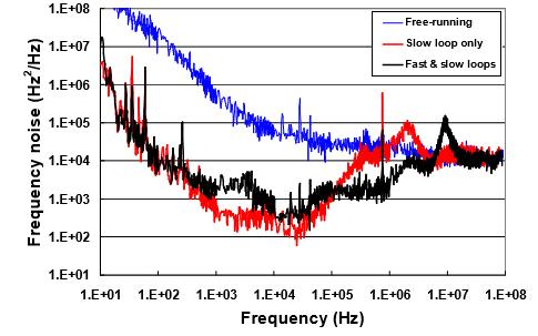通過快速和慢速的頻率鎖定環(huán)組合,實(shí)現(xiàn)了從低頻段到幾十MHz范圍內(nèi)的頻率跟蹤鎖定,大幅度降低了DFB半導(dǎo)體激光器的頻率噪聲,TeraXion把這樣的技術(shù)稱之為“激光器線寬壓縮系統(tǒng)”,從實(shí)際效果上看,頻率鎖定跟蹤方案把DFB半導(dǎo)體激光器低頻段的頻率噪聲降低了3-4個(gè)數(shù)量級(jí),大幅度壓窄了激光器的實(shí)際線寬,激光器的相干長(zhǎng)度也從數(shù)百米提高到了數(shù)十公里甚至數(shù)百公里。