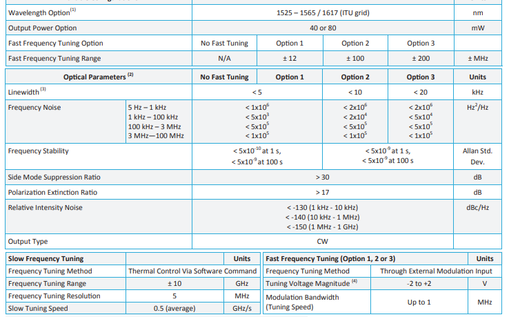 3.PureSpectrum NLL單頻半導(dǎo)體激光器的主要技術(shù)指標(biāo)