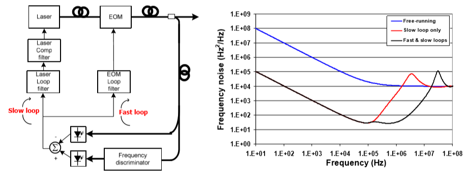 PureSpectrum NLL單頻半導(dǎo)體激光器的頻率噪聲在5Hz-1kHz低頻段展示了1/f噪聲特性。在頻率跟蹤鎖定環(huán)路的作用下,1kHz到3MHz的頻段內(nèi)的頻率噪聲得到了很好的抑制。超過3MHz的高頻段頻率噪聲水平較高,這也從另外一個(gè)角度說明TeraXion公司頻率鎖定環(huán)路的電學(xué)帶寬大約為3MHz左右。標(biāo)準(zhǔn)的頻率鎖定設(shè)計(jì)方案無法對(duì)高速的頻率波動(dòng)實(shí)現(xiàn)跟蹤鎖定,為了解決這一問題,TeraXion公司曾經(jīng)設(shè)計(jì)過高電學(xué)帶寬的高速頻率跟蹤鎖定系統(tǒng),通過增加LiNbO3光相位調(diào)制器的快速鎖定環(huán)來跟蹤快速的頻率波動(dòng)。其設(shè)計(jì)方案示意圖如下: