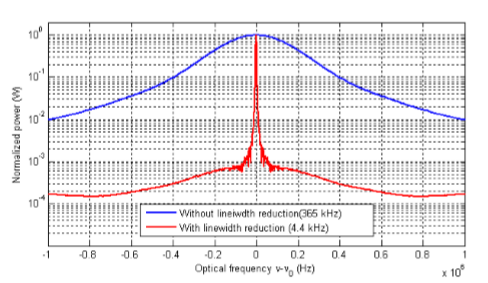 現(xiàn)代標(biāo)準(zhǔn)的電信級(jí)DFB半導(dǎo)體激光器(SCL)的線寬低于1 MHz,功率水平超過50 mW。其中特殊設(shè)計(jì)的DFB半導(dǎo)體激光器甚至可以以更低的線寬提供數(shù)百毫瓦的功率。標(biāo)準(zhǔn)電信激光器的頻率噪聲的功率譜密度(PSD)在低頻下顯示出主要的閃爍頻率噪聲,這對(duì)降低線寬系統(tǒng)的性能具有有利的影響。
