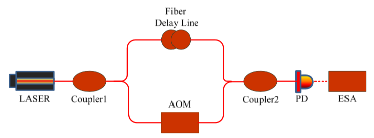 這個(gè)方案有個(gè)高大上的名字叫做:自外差非平衡M-Z干涉儀。測(cè)量線寬的原理:待測(cè)激光經(jīng)耦合器 1(Coupler 1)分成兩部分,一路光作為參考光經(jīng) 光纖延遲線延時(shí);另一路光作為信號(hào)光不延時(shí),但為了避開電子頻譜儀(Electronic Spectrum Analyzer,以下簡(jiǎn)稱為 ESA)也叫頻譜分析儀的零頻基線,提高測(cè)量精度,通常在這一支路中插入聲光調(diào)制器(AOM)來(lái)進(jìn)行移頻。本地振蕩參考光與信號(hào)光在耦合器 2(Coupler 2) 處相拍,利用 ESA 分析該拍頻信號(hào)即可確定被測(cè)激光的線寬。