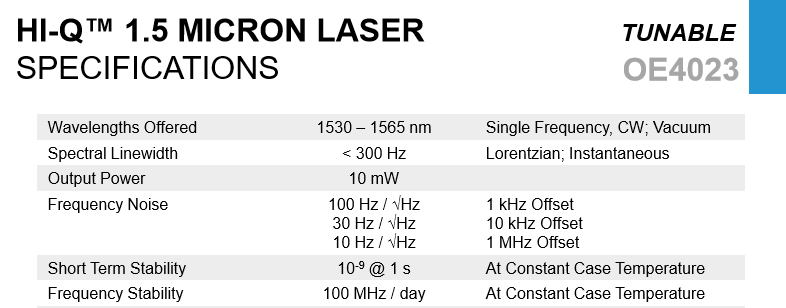 為了能夠比較清楚地區(qū)分頻率穩(wěn)定度和頻率噪聲,請看一下美國OE Waves公司提供的HI-Q系列單頻光纖激光器標(biāo)稱的技術(shù)指標(biāo)。
