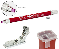 Thorlabs同時提供S90R楔形切割刀和XL411懸臂切割器用于簡單地手動切割光纖。在連接過程中,具有紅寶石尖端S90R楔形切割器可以很容易的切割套管周圍多余的光纖。XL411懸臂切割器是用于光纖光學元件熔接所需的高質(zhì)量、高重復性切割的理想選擇。FTDU收集丟棄的切割終端,提供安全的解決方案。我們推薦使用這樣的垃圾桶,放止被光纖碎片劃傷。此外,Thorlabs提供一系列的配套光纖端接的產(chǎn)品和工具 。