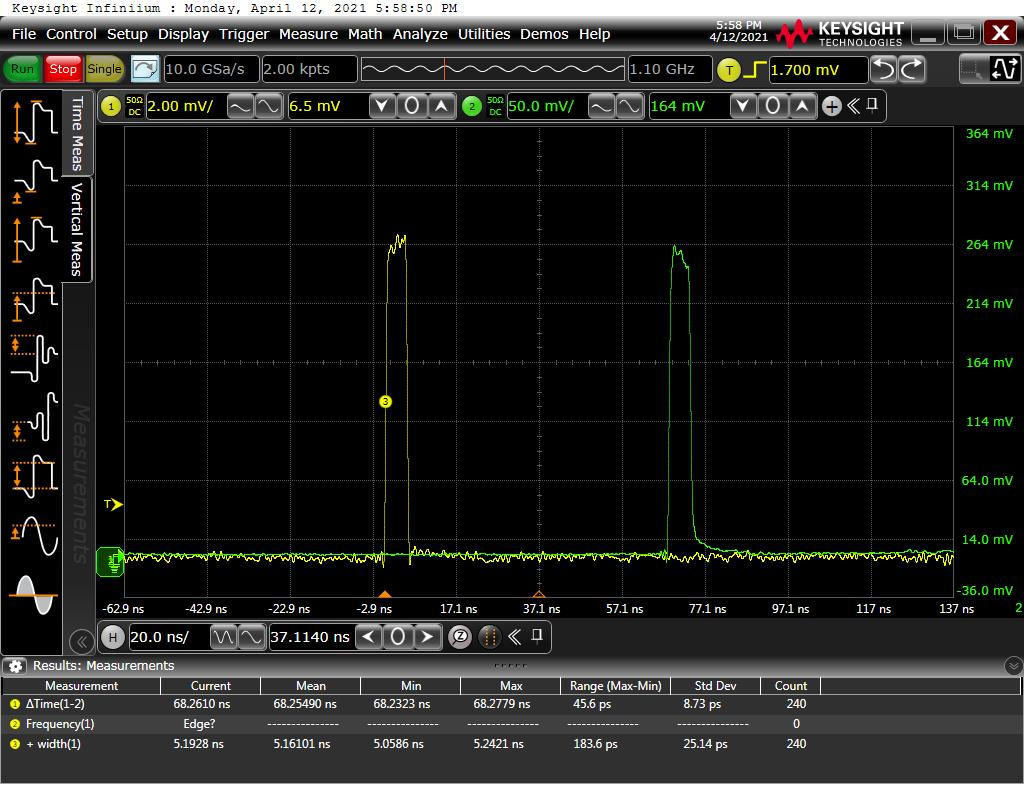 ▲ 圖三:重頻@500KHz ▲ 圖四:參考光與輸出光的延時(shí) 68ns