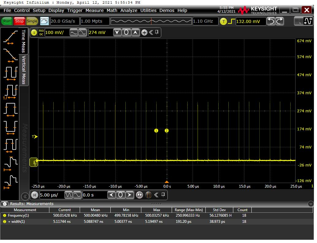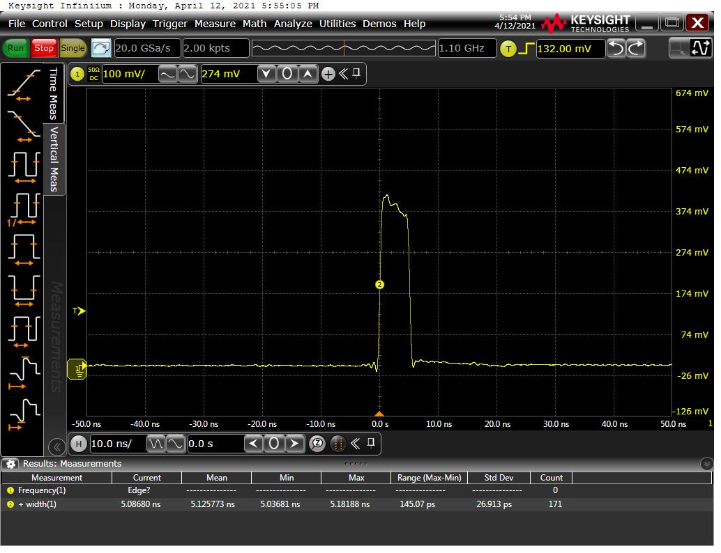 ▲ 圖一:最大輸出功率實(shí)測光譜圖@5ns/500KHz ▲ 圖二:輸出脈寬@5ns